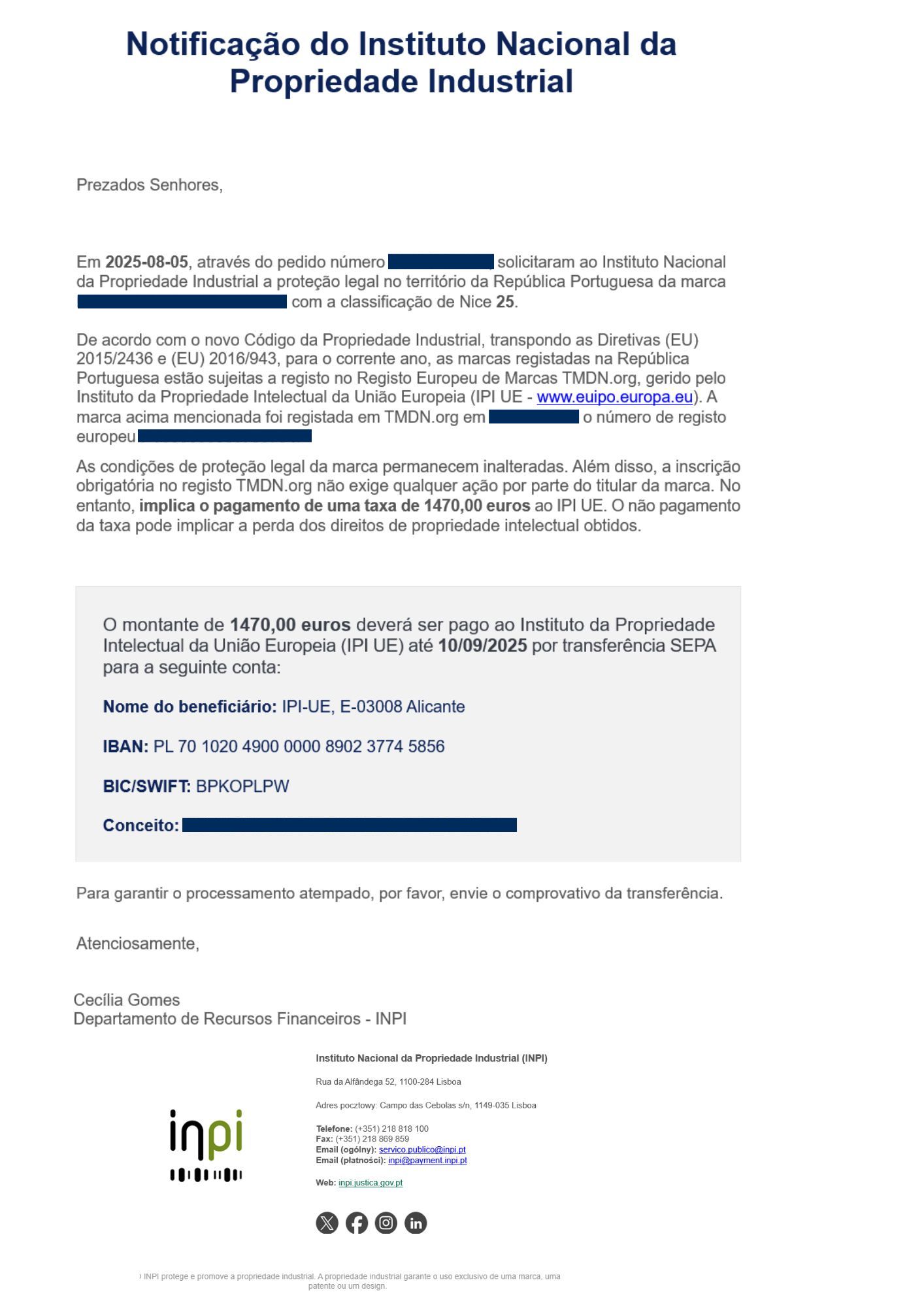 - O INPI nunca solicita por email a transferência de montantes para determinada conta ou IBAN;